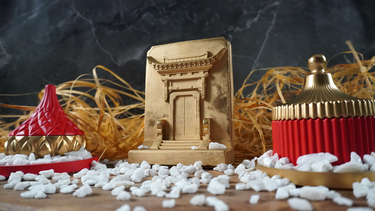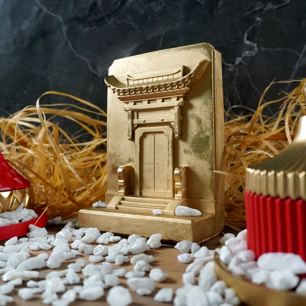 Набор из золотых китайских врат, стилизованных соевых свечей с восточными ароматами в комплекте со стилизованными подстаканниками и декоративной мраморной крошкой