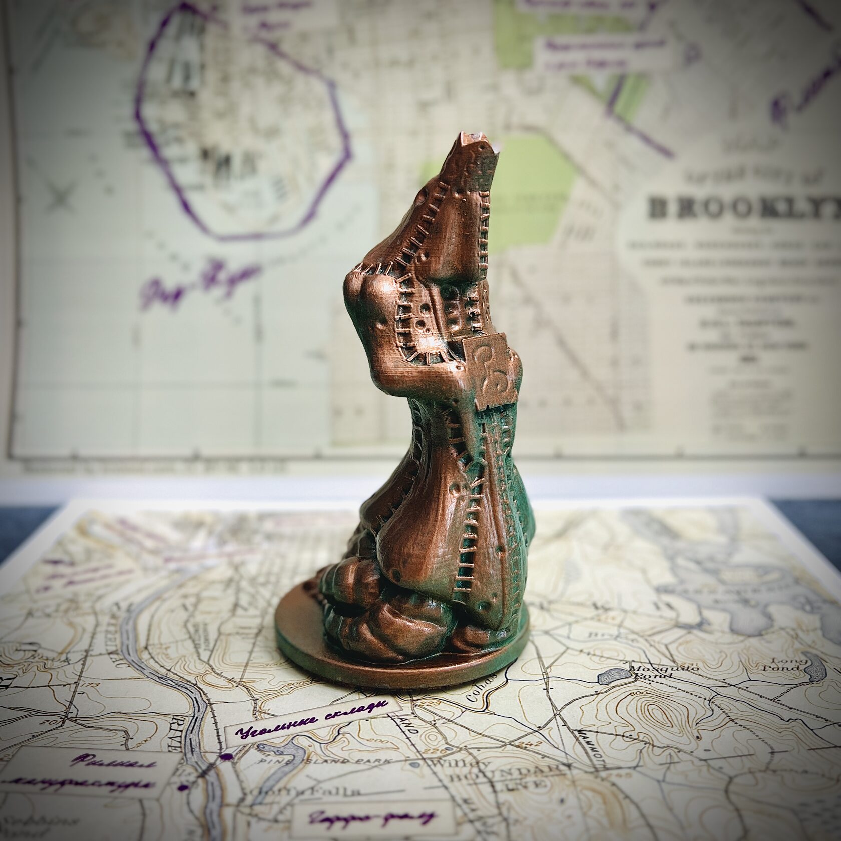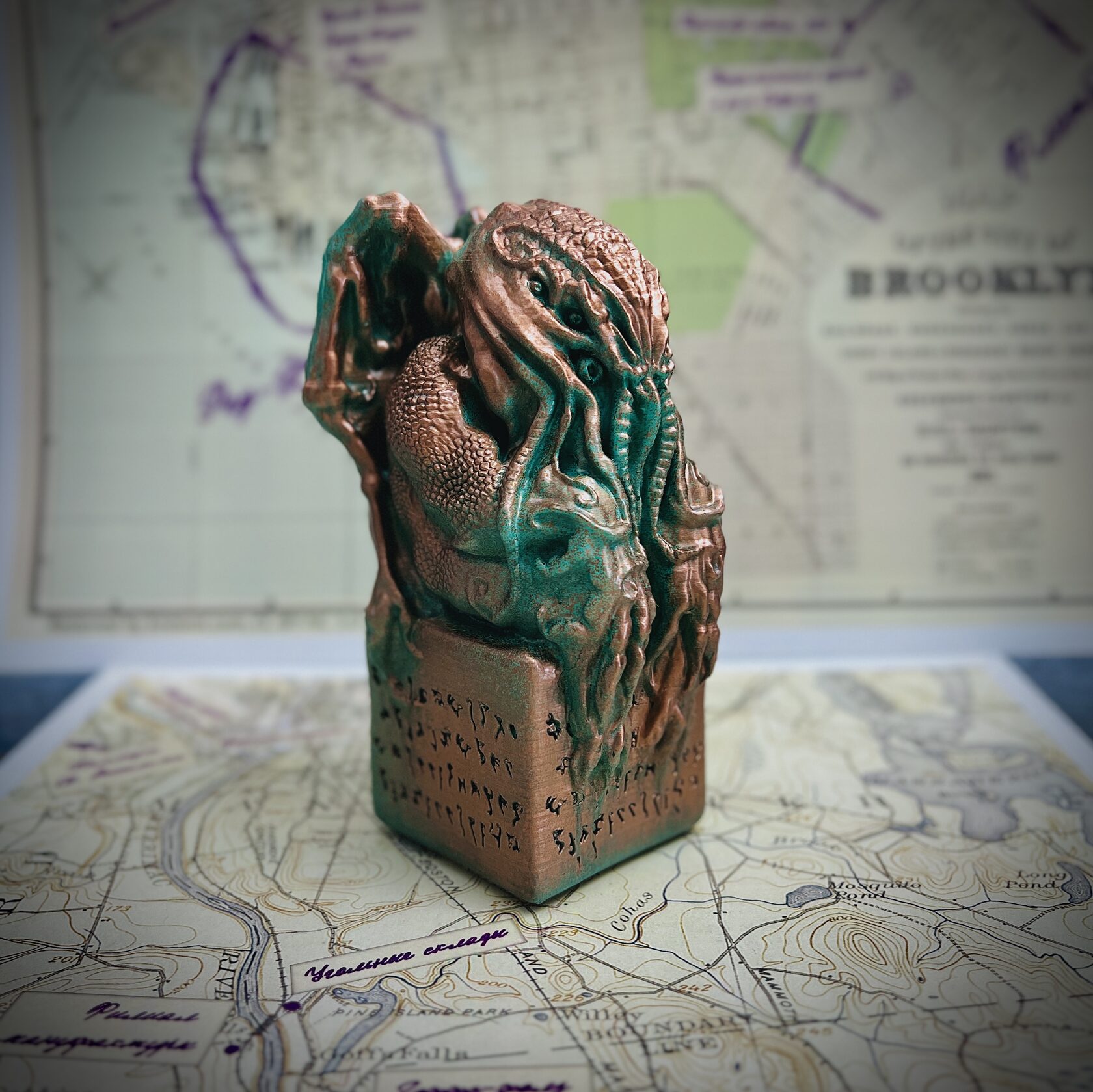 Статуэтка Великого Древнего на пьедестале. Не смотря на то, что согласно легендам сам владыка миров пребывает на дне Тихого океана, его образы вовсю используются последователями. Данная статуэтка была восстановлена нами и в настоящий момент, пожалуй, не представляет опасности. Хотя, никогда не знаешь, чего можно ожидать, если долго вглядываться в бездну...