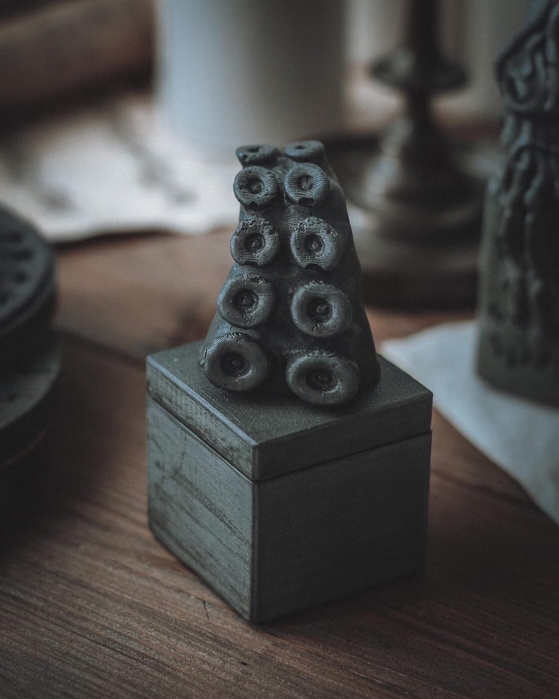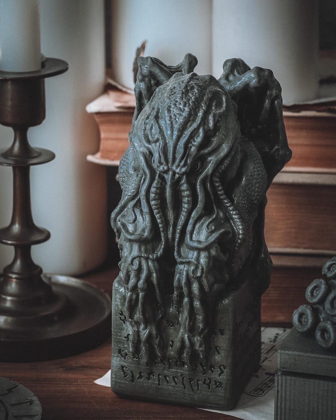 Статуэтка Великого Древнего на пьедестале. Не смотря на то, что согласно легендам сам владыка миров пребывает на дне Тихого океана, его образы вовсю используются последователями. Данная статуэтка была восстановлена нами и в настоящий момент, пожалуй, не представляет опасности. Хотя, никогда не знаешь, чего можно ожидать, если долго вглядываться в бездну...