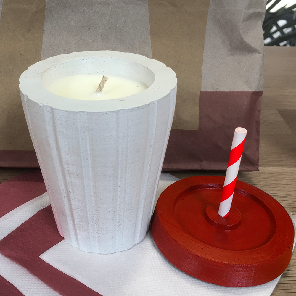 Исполненный в стиле классического стаканчика для молочного коктейля подсвечник, наполненный свечой с тем самым ароматом "клубничного шейка".
